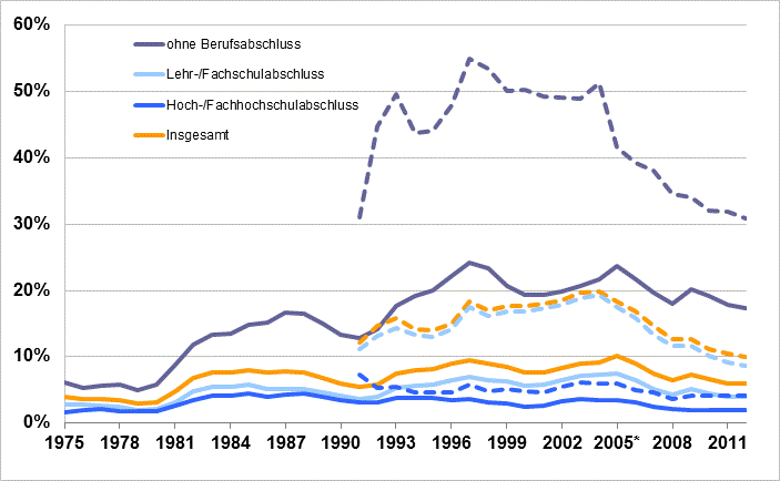 Je geringer das Bildungsniveau, desto höher das Arbeitslosigkeitsrisiko. Dieser Zusammenhang hat sich im Laufe der Jahre dramatisch verstärkt. Heute ist fast jeder fünfte Geringqualifizierte arbeitslos, während es in den 1970er Jahren nur jeder Zwanzigste war. Besonders drastisch ist die Situation in Ostdeutschland. Der starke Rückgang der Arbeitslosenquote Geringqualifizierter in Ostdeutschland zwischen 2004 und 2005 ist darauf zurückzuführen, dass ab 2005 auch das arbeitslosärmere und bevölkerungsstarke West-Berlin Ostdeutschland zugerechnet wird.