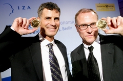 The IZA Prize in Labor Economics 2006 is awarded to the outstanding American labor economists David Card (University of California, Berkeley) and Alan B. Krueger (Princeton University). According to the IZA Prize Committee, their work has crucially shaped the research agenda in labor economics and has raised the standards for empirical research in applied economics. "David Card and Alan Krueger have stimulated labor economics for many years with their original research approaches, the practical relevance of their results, and their remarkable use of natural experiments to test common hypotheses," said IZA Director Klaus F. Zimmermann during the announcement of the IZA Prize Committee decision in Bonn. "The findings by Card and Krueger are highly relevant for labor market policy in Germany, particularly with regard to raising school quality." The 2006 IZA Prize was awarded by Klaus Zumwinkel, CEO of Deutsche Post World Net and President of IZA, and IZA Director Klaus F. Zimmermann on November 8 during a festive ceremony in Berlin. Deutsche Post World Net has sponsored IZA since the foundation of the institute in 1998. The IZA Prize was established in 2002 and carries a cash award of 50,000 euros. It is considered the most esteemed science award in labor economics worldwide. More information: Award Statement | IZA Press Statement | IZA Prize Homepage | Handelsblatt article (in German)