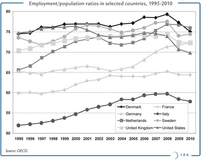 After decades of mainly negative perception both from within Germany and abroad, the German employment “model” is attracting quite some attention again. This is mainly due to its success in weathering the recent global economic crisis: While other countries experienced major job losses, Germany witnessed decreasing unemployment rates and record levels of newly created jobs. In fact, after a long period of stagnation, Germany has now one of the highest employment rates in Continental European countries, closing up to such countries as Denmark, Sweden or the Netherlands and similar to the UK (see figure on the right). Quite unexpectedly, as Germany was often seen as a laggard with a persistent weakness in job creation, the country is now on par with former role model or benchmark countries. Furthermore, accelerated job creation in Germany cannot only be attributed to the emergence of an additional layer of “bad jobs” at the margin of the labor market due to deregulation, but it is also partly driven by structural changes encouraging the creation of many “good jobs” in skilled service sector occupations. However, the recent change in labor market conditions did not evolve over night. It is not sufficient to focus only on the impressive performance during the crisis. The overall improvement in labor market outcomes is the effect of a longer sequence of cumulative structural and institutional adjustment revitalizing some of Germany’s traditional strengths and adding some new elements. Particularly remarkable is the fact that most of these adjustments were not part of a long-term strategy, but rather short-term oriented. Instead of relying on systematic economy-wide coordination, small steps of adjustment were taken in employers’ staffing policies and collective bargaining, as well as in public labor market policies and regulation.