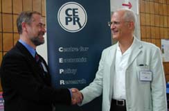 IZA Director Klaus F. Zimmermann served as CEPR Programme Director from 1991-2001 (first for Human Resources, later for Labour Economics). In August 2001, Zimmermann stepped down from this post due to his various commitments as IZA Director and DIW President. At the 2001 EEA meetings in Lausanne, CEPR President Richard Portes (see above photo, right) took the opportunity to thank Zimmermann personally for his record-setting ten years as Programme Director. "You have been a major force in building up the Labour Economics network," Portes said, "and you have made a considerable impact on a wide range of CEPR activities. I have valued very greatly your support and leadership in the development of the Centre."