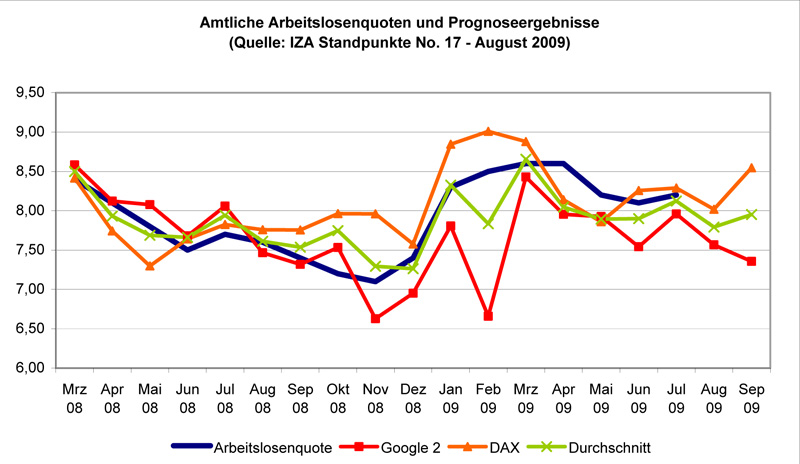 | | For the month of August, both the Google indicator and a reference indicator based on the DAX stock index predict a reduction in unemployment. Since this is in line with the usual seasonal trend, there are no signs that the economic crisis has already had a massive impact on the labor market at this point. Of course, the forecasts for September 2009 are prone to greater uncertainty as they rely on estimates of the future Google and DAX trends. According to the Google indicator, unemployment will continue to fall in September (again in line with seasonal trends). While the DAX indicator predicts a rise in unemployment, it should not be overestimated because forecasts of the DAX are particularly uncertain. |